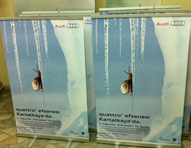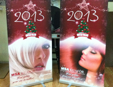 Roll Up dijital baskı için tasarım yapılır.Tasarım aşamasından sonra yapılan dijital baskı rollup üzerine monte edilir.